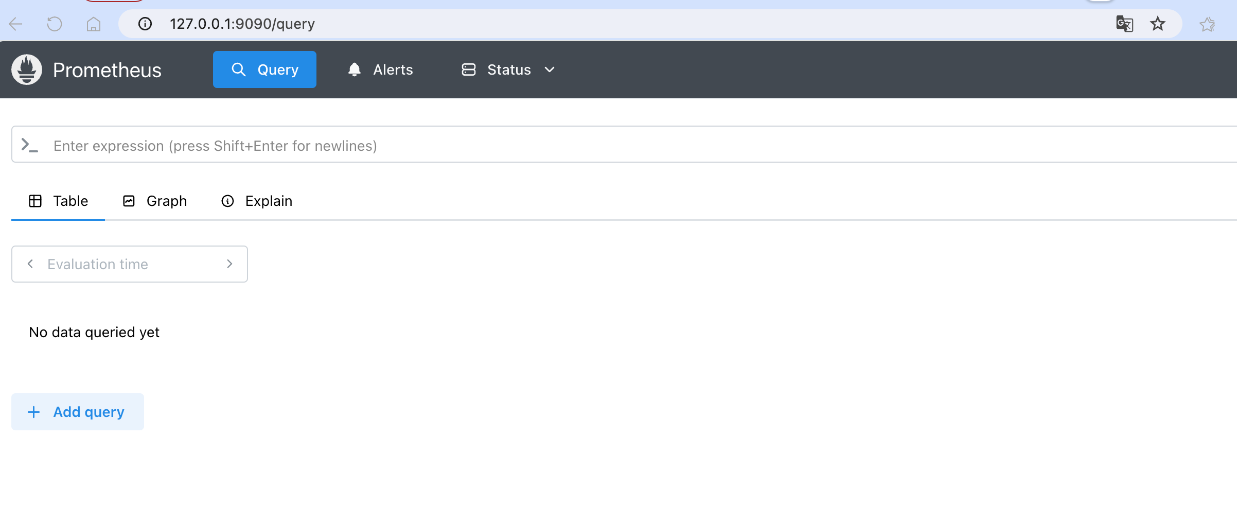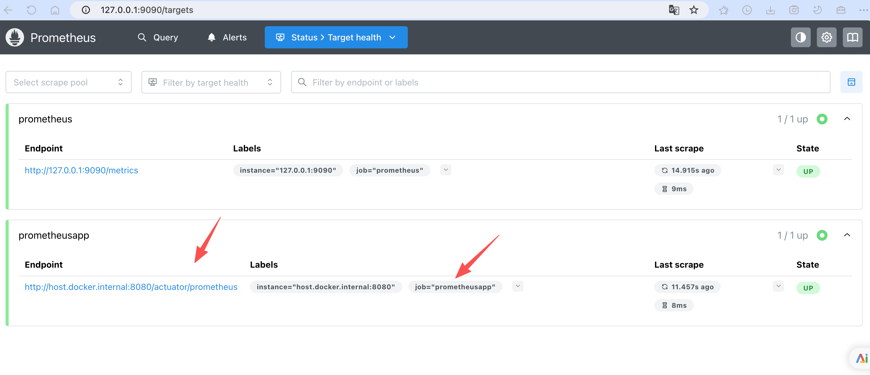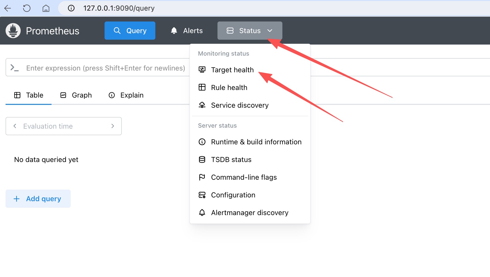访问地址: http://127.0.0.1:9090/, 选择 status 栏目下的 Target health ,查看应用的监控状态信息。
