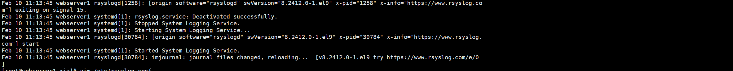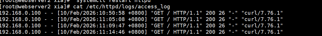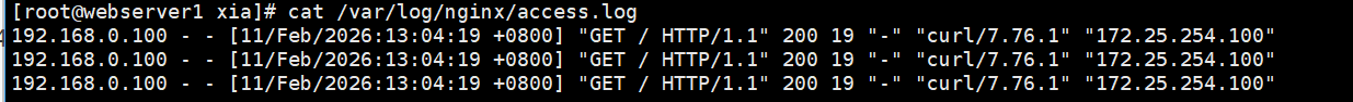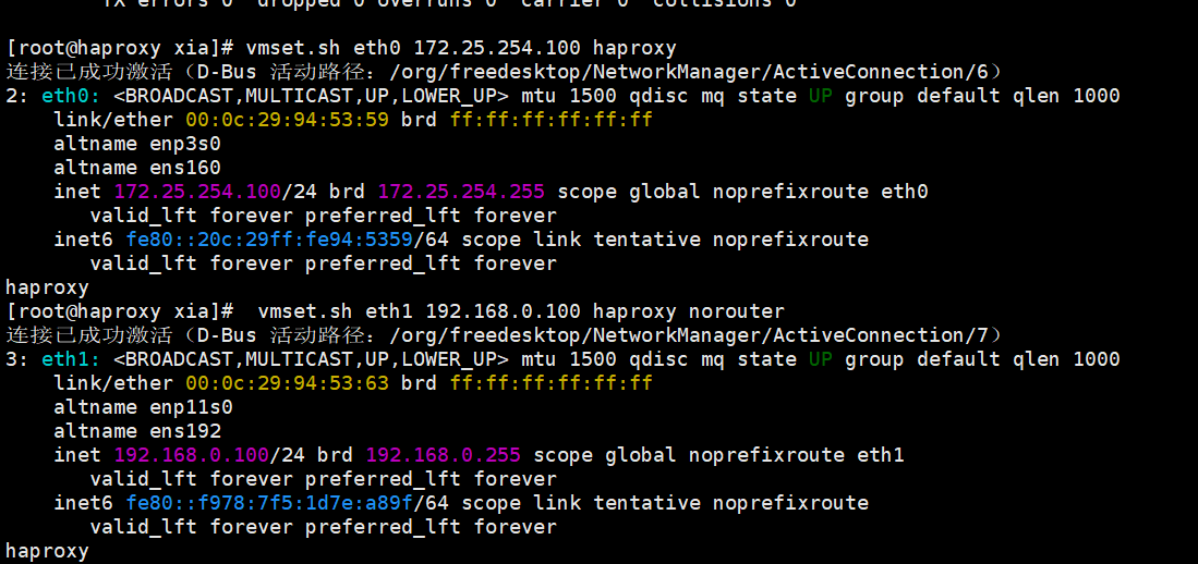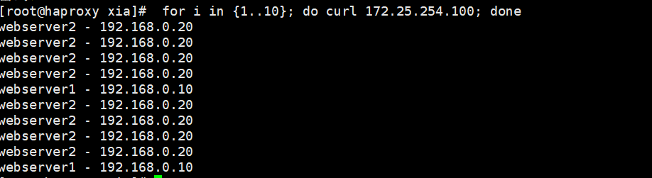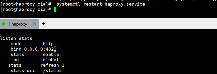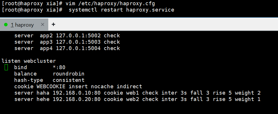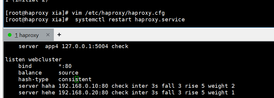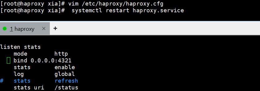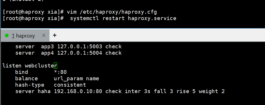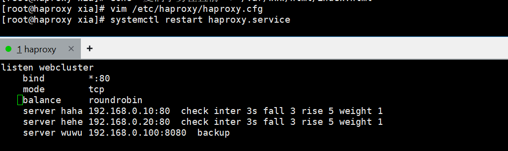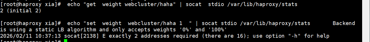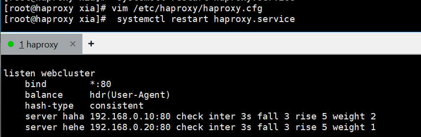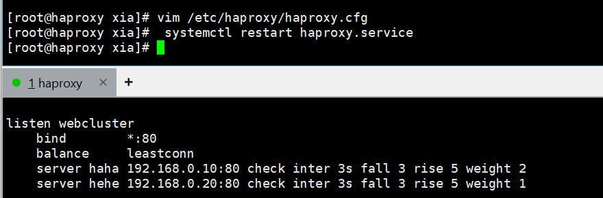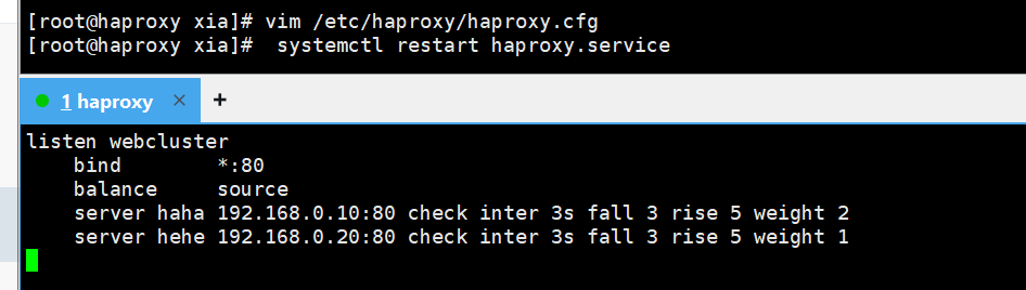 root@haproxy xia\]# echo net.ipv4.ip_forward=1 \> /etc/sysctl.conf \[root@haproxy xia\]# sysctl -p net.ipv4.ip_forward = 1 * 值为 1 时,表示开启 IP 转发(系统会充当路由器,转发不同网段的数据包); * 值为 0 时(默认),关闭 IP 转发,系统仅处理发往本机的数据包。 * 永久开启 Linux 系统的 IP 转发功能。 webserver1 配IP  \[root@webserver1 xia\]# mount /dev/sr0 /mnt 挂载硬盘 mount: /mnt: WARNING: source write-protected, mounted read-only. \[root@webserver1root@webserver1 \~\]# dnf install httpd -y  webserver2 配IP  \[root@webserver2 xia\]# mount /dev/sr0 /mnt 挂载硬盘 mount: /mnt: WARNING: source write-protected, mounted read-only. \[root@webserver2 xia\]# dnf install httpd -y  验证  #表示网络连通了 ### 2.Haproxy的安装及配置参数 #### 2.1安装 \[root@haproxy xia\]# mount /dev/sr0 /mnt mount: /mnt: WARNING: source write-protected, mounted read-only. \[root@haproxy xia\]# dnf install haproxy.x86_64 -y #### 2.2harpoxy的参数详解实验 1设定vim中tab键的空格个数 \[root@haproxy xia\]# vim ./vimrc set ts=4 ai \[root@haproxy xia\]# vim /etc/haproxy/haproxy.cfg  \[root@haproxy xia\]# systemctl restart haproxy.service 测试  #用listen方式书写负载均衡 \[root@haproxy xia\]# vim /etc/haproxy/haproxy.cfg  \[root@haproxy xia\]# systemctl restart haproxy.service 测试  2.log 指定把日志发送到哪里 实验。指定日志发送到192.168.0.10 #在192.168.0.10 开启接受日志的端口 \[root@webserver1 xia\]# vim /etc/rsyslog.conf  \[root@webserver1 xia\]# systemctl restart rsyslog.service #测试接受日志端口是否开启 \[root@webserver1 xia\]# netstat -antlupe \| grep rsyslog udp 0 0 0.0.0.0:514 0.0.0.0:\* 0 64123 30797/rsyslogd udp6 0 0 :::514 :::\* 0 64124 30797/rsyslogd #在haproxy主机中设定日志发送信息 \[root@haproxy haproxy\]# vim haproxy.cfg log 192.168.0.10 local2 \[root@haproxy haproxy\]# systemctl restart haproxy.service 测试  root@webserver1 \~\]# cat /var/log/messages 查看日志  ### 3.实现haproxy的多进程 \[root@haproxy xia\]# pstree -p \| grep haproxy \|-haproxy(30610)---haproxy(30612)-+-{haproxy}(30613) \| \|-{haproxy}(30614) \| \`-{haproxy}(30615) \[root@haproxy xia\]# vim /etc/haproxy/haproxy.cfg  \[root@haproxy xia\]# systemctl restart haproxy.service \[root@haproxy xia\]# pstree -p \| grep haproxy \|-haproxy(30685)-+-haproxy(30687) \| \`-haproxy(30688) #多进程cpu绑定 \[root@haproxy xia\]# vim /etc/haproxy/haproxy.cfg  \[root@haproxy xia\]# systemctl restart haproxy.service #为不同进程准备不同套接字 \[root@haproxy xia\]# vim /etc/haproxy/haproxy.cfg \[root@haproxy xia\]# systemctl restart haproxy.service \[root@haproxy xia\]# systemctl stop haproxy.service \[root@haproxy xia\]# rm -fr /var/lib/haproxy/stats \[root@haproxy xia\]# vim /etc/haproxy/haproxy.cfg  \[root@haproxy xia\]# systemctl restart haproxy.service #效果  ### 4.haproxy实现多线程 注意多线程不能和多进程同时启用 #查看当前haproxy的进程信息 \[root@haproxy xia\]# pstree -p \| grep haproxy \|-haproxy(30711)-+-haproxy(30713) \| \`-haproxy(30714) #查看haproxy子进程的线程信息 \[root@haproxy xia\]# cat /proc/30713/status \| grep Threads Threads: 1 #启用多线程 \[root@haproxy xia\]# vim /etc/haproxy/haproxy.cfg  \[root@haproxy xia\]# systemctl restart haproxy.service \[root@haproxy xia\]# pstree -p \| grep haproxy \|-haproxy(30730)---haproxy(30732)---{haproxy}(30733) 效果 \[root@haproxy xia\]# cat /proc/30732/status \| grep Threads Threads: 2 ## 四.socat热更新工具 热更新 在服务或软件不停止的情况下更新软件或服务的工作方式,完成对软件不停工更新,典型的热更新设备,usb,在使用usb进行插拔时,电脑系统时不需要停止工作的,这中设备叫热插拔设备。 ### 1.安装socat \[root@haproxy xia\]# mount /dev/sr0 /mnt \[root@haproxy xia\]# dnf install socat -y \[root@haproxy xia\]# socat -h 查看 socat 工具的帮助信息 ### 2.利用socat查看haproxy信息 \[root@haproxy xia\]# echo "show servers state" \| socat stdio /var/lib/haproxy/stats 查询所有后端服务器的底层运行状态 1 # be_id be_name srv_id srv_name srv_addr srv_op_state srv_admin_state srv_uweight srv_iweight srv_time_since_last_change srv_check_status srv_check_result srv_check_health srv_check_state srv_agent_state bk_f_forced_id srv_f_forced_id srv_fqdn srv_port srvrecord srv_use_ssl srv_check_port srv_check_addr srv_agent_addr srv_agent_port 3 static 1 static 127.0.0.1 0 0 1 1 897 8 2 0 6 0 0 0 - 4331 - 0 0 - - 0 4 app 1 app1 127.0.0.1 0 0 1 1 897 8 2 0 6 0 0 0 - 5001 - 0 0 - - 0 4 app 2 app2 127.0.0.1 0 0 1 1 897 8 2 0 6 0 0 0 - 5002 - 0 0 - - 0 4 app 3 app3 127.0.0.1 0 0 1 1 896 8 2 0 6 0 0 0 - 5003 - 0 0 - - 0 4 app 4 app4 127.0.0.1 0 0 1 1 896 8 2 0 6 0 0 0 - 5004 - 0 0 - - 0 5 webcluster 1 haha 192.168.0.10 2 0 1 1 897 6 3 7 6 0 0 0 - 80 - 0 0 - - 0 5 webcluster 2 hehe 192.168.0.20 2 0 1 1 897 6 3 7 6 0 0 0 - 80 - 0 0 - - 0 \[root@haproxy xia\]# echo "get weight webcluster/haha" \| socat stdio /var/lib/haproxy/stats 查询指定后端服务器的当前权重值 1 (initial 1) \[root@haproxy xia\]# echo "get weight webcluster/hehe" \| socat stdio /var/lib/haproxy/stats 查询 webcluster/hehe 服务器的权重 1 (initial 1) ### 3.利用socat更改haproxy信息 #直接更改报错 \[root@haproxy xia\]# echo "set weight webcluster/haha 2" \| socat stdio /var/lib/haproxy/stats Permission denied #对socket进行授权 \[root@haproxy xia\]# vim /etc/haproxy/haproxy.cfg  \[root@haproxy xia\]# rm -rf /var/lib/haproxy/\* \[root@haproxy xia\]# systemctl restart haproxy.service \[root@haproxy xia\]# ll /var/lib/haproxy/ 总用量 0 srw------- 1 root root 0 2月 11 10:21 stats #对socket进行授权 \[root@haproxy xia\]# echo "get weight webcluster/hehe" \| socat stdio /var/lib/haproxy/stats 1 (initial 1) \[root@haproxy xia\]# echo "set weight webcluster/hehe 4 " \| socat stdio /var/lib/haproxy/stats \[root@haprox