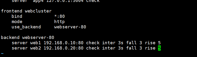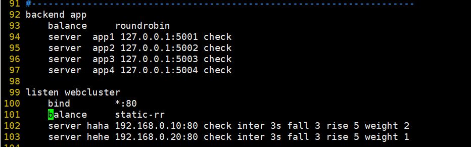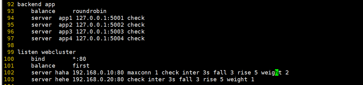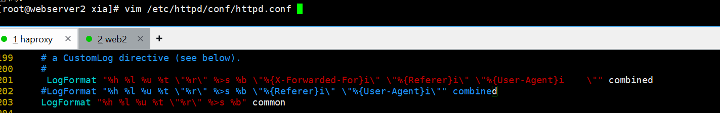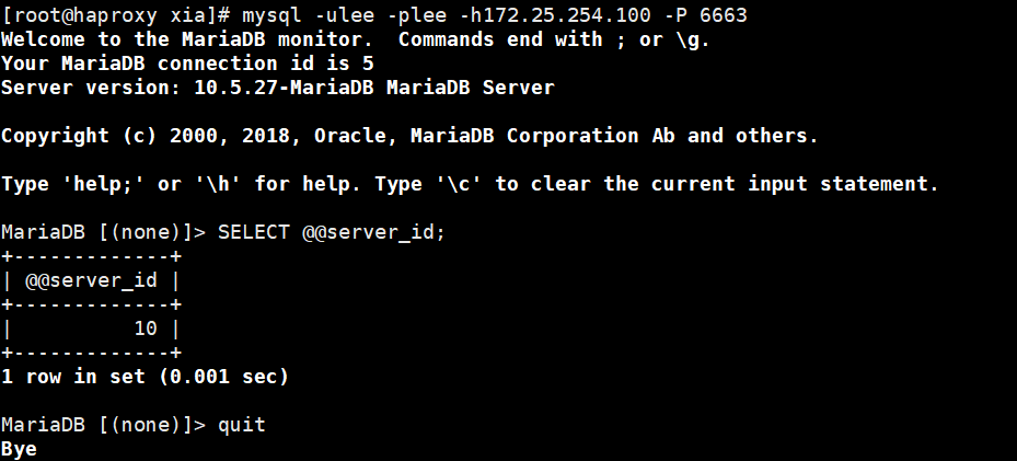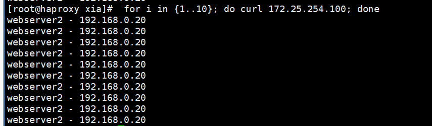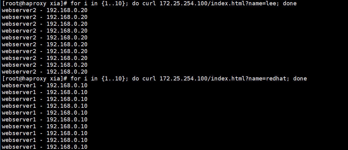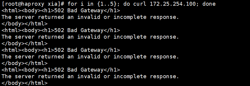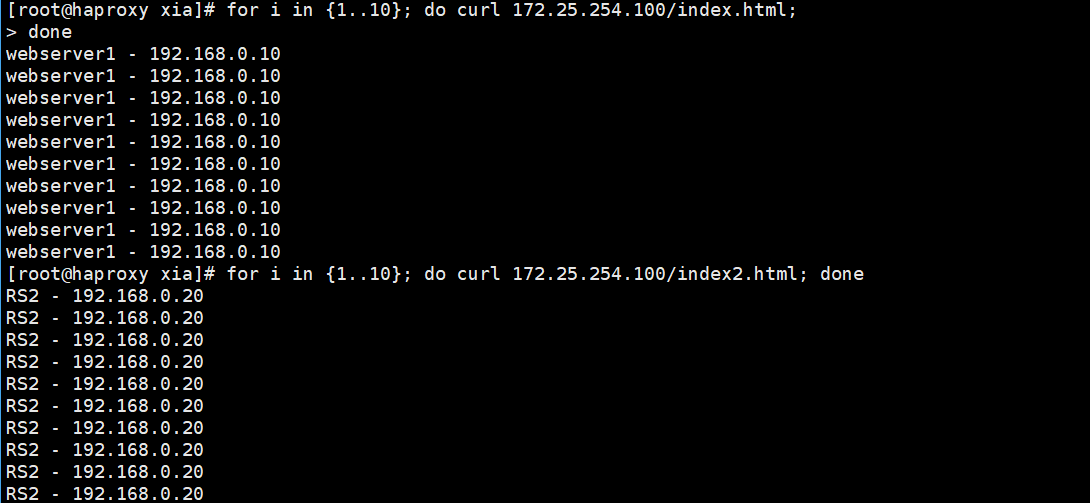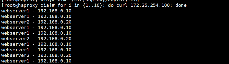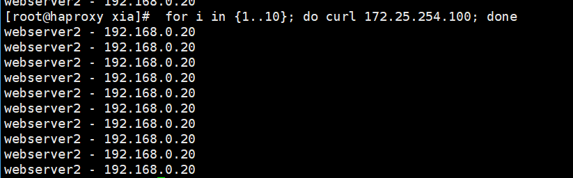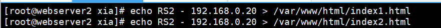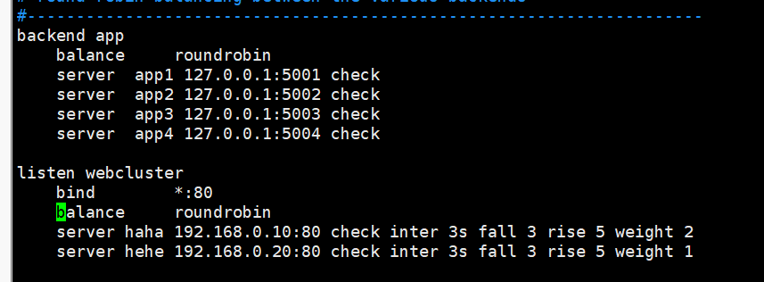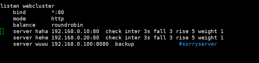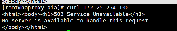 root@webserver1/2 xia\]# systemctl start mariadb.service \[root@webserver1/2 xia\]# mysql  测试 \[root@webserver2 xia\]# mysql -ulee -plee -h 192.168.0.20 #测试10时修改ip即可  #四层负载操作  检测端口  验证  backup参数   关闭10的mariadb并等待1分钟 \[root@webserver1 xia\]# systemctl stop mariadb \[Administrator.DESKTOP-VJ307M3\] ➤ mysql -ulee -plee -h172.25.254.100 -P 6663 ERROR 2013 (HY000): Lost connection to MySQL server at 'reading initial communication packet', system error: 1 "Operation not permitted" #标识haproxy 没有完成故障转换,需要等待 \[Administrator.DESKTOP-VJ307M3\] ➤ mysql -ulee -plee -h172.25.254.100 -P 6663 Welcome to the MariaDB monitor. Commands end with ; or \\g. Your MariaDB connection id is 11 Server version: 10.5.27-MariaDB MariaDB Server Copyright (c) 2000, 2017, Oracle, MariaDB Corporation Ab and others. Type 'help;' or '\\h' for help. Type '\\c' to clear the current input statement. MariaDB \[(none)\]\> SELECT @@server_id; +-------------+ \| @@server_id \| +-------------+ \| 20 \| +-------------+ 1 row in set (0.00 sec) MariaDB \[(none)\]\> #还原故障主机等待片刻 \[root@webserver1 xia\]# systemctl start mariadb \[Administrator.DESKTOP-VJ307M3\] ➤ mysql -ulee -plee -h172.25.254.100 -P 6663 Welcome to the MariaDB monitor. Commands end with ; or \\g. Your MariaDB connection id is 4 Server version: 10.5.27-MariaDB MariaDB Server Copyright (c) 2000, 2017, Oracle, MariaDB Corporation Ab and others. Type 'help;' or '\\h' for help. Type '\\c' to clear the current input statement. MariaDB \[(none)\]\> SELECT @@server_id; +-------------+ \| @@server_id \| +-------------+ \| 10 \| +-------------+ 1 row in set (0.00 sec) ## 十.自定义HAProxy 错误界面 ### 1.sorryserver的设定 正常的所有服务器如果出现宕机,那么客户将被定向到指定的主机中,这个当业务主机出问题时被临时访问的主机叫做sorryserver #在新主机中安装apache(可以用haproxy主机代替) \[root@haproxy xia\]# dnf install httpd -y \[root@haproxy xia\]# vim /etc/httpd/conf/httpd.conf  \[root@haproxy xia\]# systemctl enable --now httpd Created symlink /etc/systemd/system/multi-user.target.wants/httpd.service → /usr/lib/systemd/system/httpd.service. \[root@haproxy xia\]# echo "夏润宇勇往直前" \> /var/www/html/index.html #配置sorryserver上线  验证  \[root@webserver1/2 xia\]# systemctl stop httpd  ### 2.自定义错误页面 当所有主机包括sorryserver都宕机了,那么haproxy会提供一个默认访问的错误页面,这个错误页面跟报错代码有关,这个页面可以通过定义来机型设置 #出现的错误页面 \[root@webserver1/2 xia\]# systemctl stop httpd \[root@haproxy xia\]# systemctl stop httpd 注意vim /errorpage/html/503.http 脚本里面的tcp要改成http  #所有后端web服务都宕机  \[root@haproxy \~\]# mkdir /errorpage/html/ -p \[root@haproxy \~\]# vim /errorpage/html/503.http \[root@haproxy \~\]# cat /errorpage/html/503.http HTTP/1.0 503 Service Unavailable Cache-Control: no-cache Connection: close Content-Type: text/html;charset=UTF-8 \\