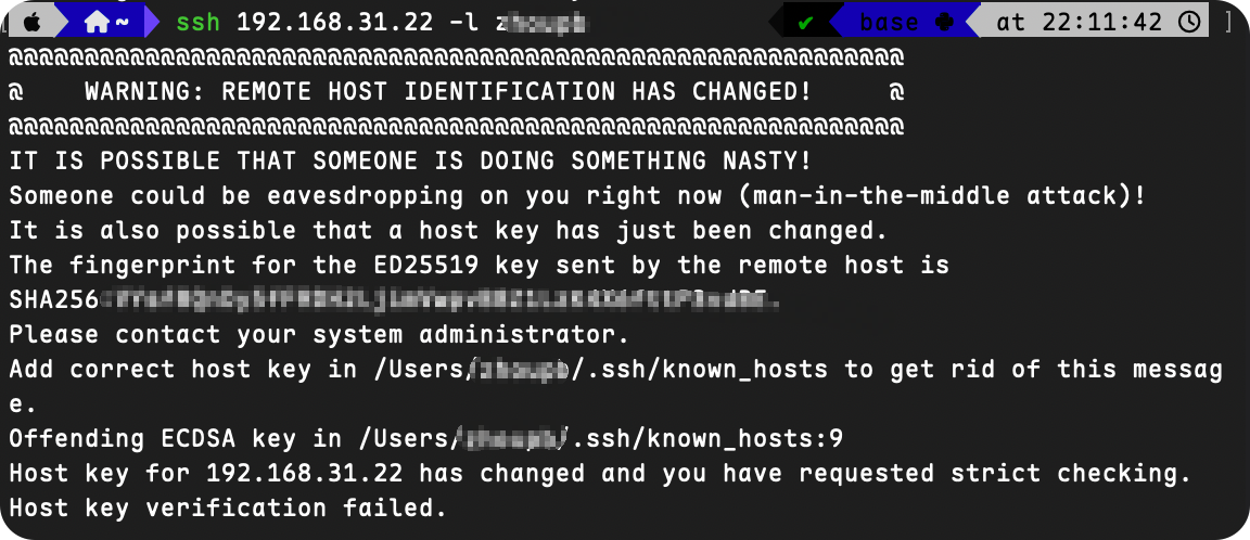 ⚠️ 如果回车后出现 WARNING: REMOTE HOST IDENTIFICATION HAS CHANGED! 提示,表示远程服务器的密钥与之前记录在 known_hosts 文件中的不一致。