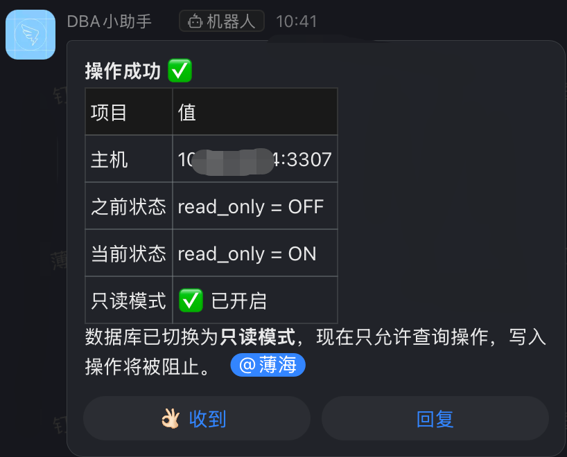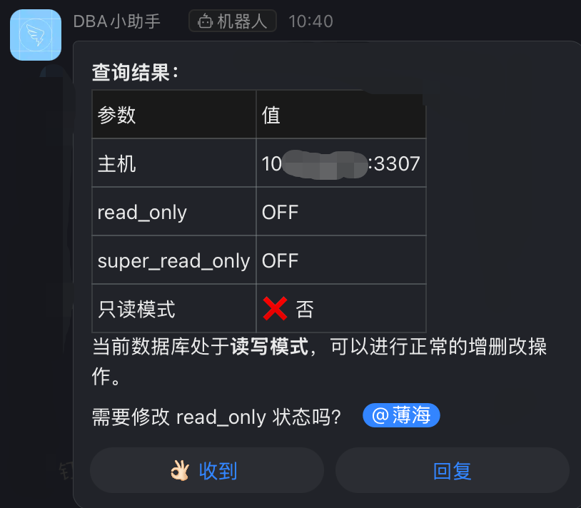 我们通过给机器人下指令,让数据库只读状态由off改为on。