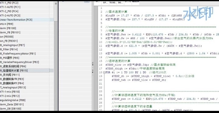 西门子S7-1500暖通空调制药厂洁净空调PLC程序案例,硬件采用西门子1500CPU+ET200SP接口IO模块,HMI采用西门子触摸屏。 具体为制药厂BMS(洁净空调自控系统)医药洁净室程序,程序结构采用SCL编程。 有详细注释,很方便能看懂; 串级PID,分程调节,控温控湿效果非常好; 程序打开版本博图V15.1