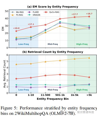 在低频实体场景中,QuCo-RAG展现出压倒性优势,相比无RAG基线提升10-17个EM点。而DRAGIN和FLARE尽管触发了检索,但性能几乎与无RAG基线相同。这表明模型在罕见实体上缺乏足够的信号来识别不确定性,而QuCo-RAG通过语料库统计量准确捕获了这种长尾知识风险。