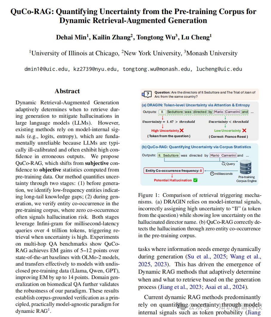 本文提出QuCo-RAG框架,通过预训练语料库统计量而非模型内部信号来量化不确定性,解决动态检索增强生成中的幻觉问题。该方法在多跳问答任务上相比最优基线提升5-12个EM点,并可迁移至未公开训练数据的模型,为动态RAG建立了基于语料库验证的新范式。