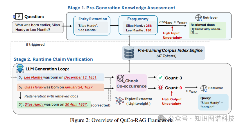 在生成开始前,QuCo-RAG查询实体在预训练语料库中的出现频率。当检测到低频实体时(表示长尾知识风险),系统会触发检索以获取必要的背景知识。