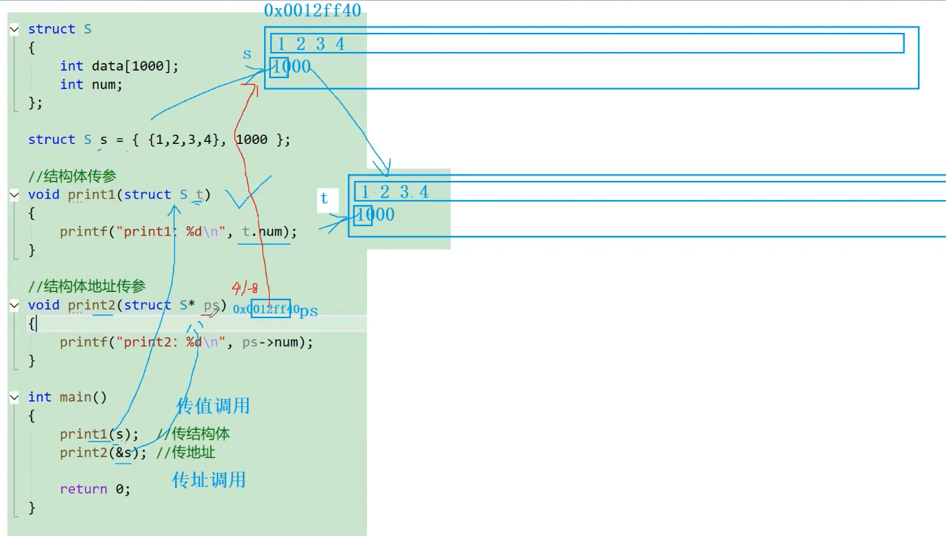 如果传递一个结构体对象的时候,结构体过大,参数压栈的的系统开销比较大,所以会导致性能的下降。