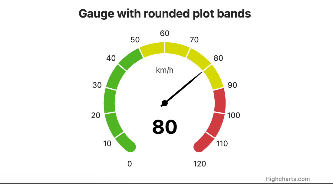 角度仪表也被称为刻度盘或类似速度计的小部件,能够为仪表盘提供极佳的可视化效果。与极坐标图类似,我们扩展了已有的系列/点/轴模型,并将仪表作为一种新的系列类型实现,配备一个数值轴,即 y 轴。这意味着,您在使用其他 Highcharts 系列类型进行动态和静态操作时所学到的内容,也同样适用于角度仪表。