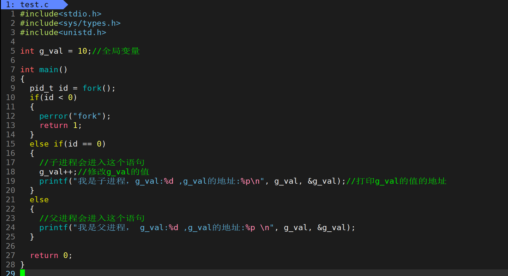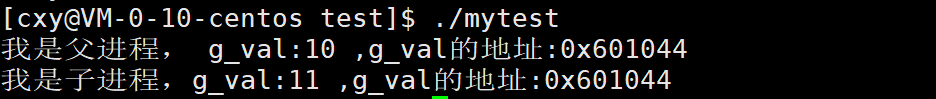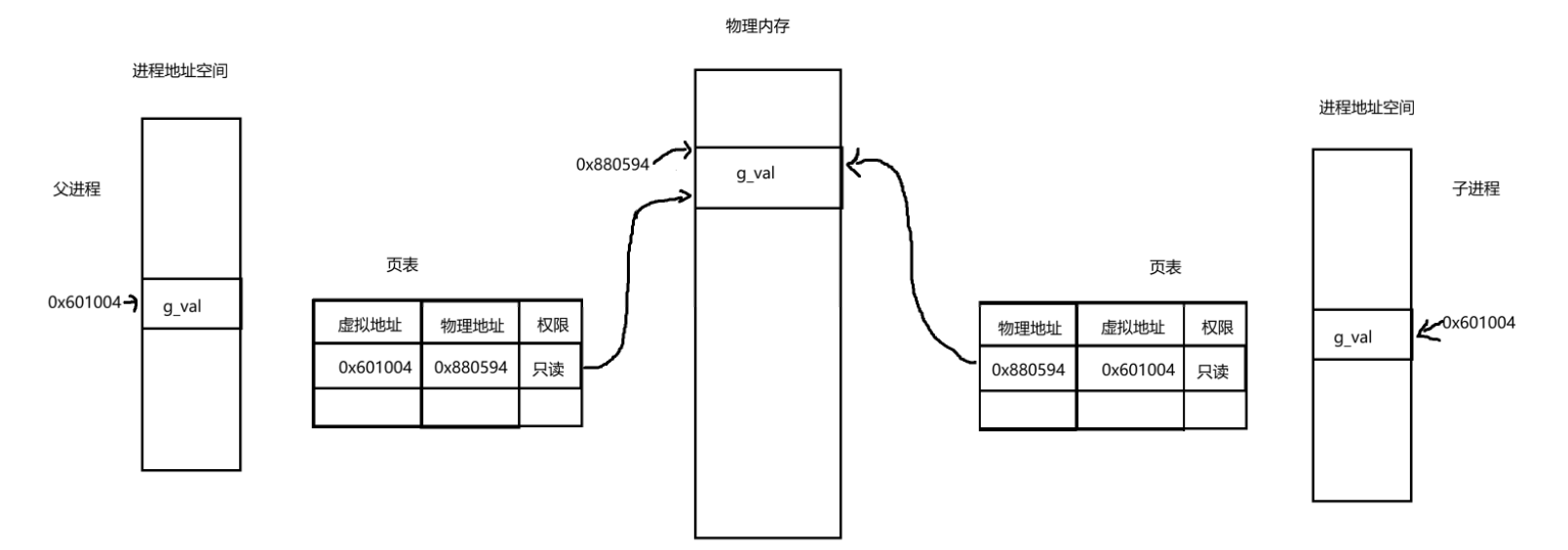 但是这里有个奇怪的现象,就是子进程的g_val的地址和父进程g_val的地址是相同的!