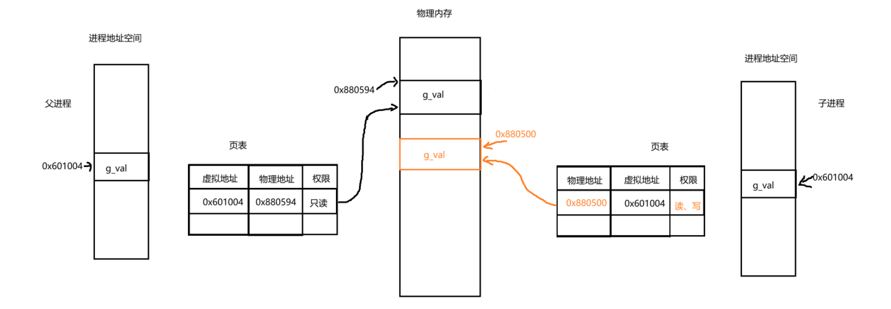 子进程共享父进程的数据和代码。当子进程和父进程都没有对这个数据进行修改时。权限都是只读的。当进程要对这个g_val修改时(这里时子进程修改)。操作系统会先把g_val的虚拟地址在页表中查找看看有没有对应的物理地址。这里发现有对应的物理地址。操作系统就尝试对这个物理地址空间里面的内容进行修改。但是修改时发生了权限问题。只有读的权限,没有写的权限。所以此时就发生了写时拷贝。操作系统重新给子进程申请了新的变量g_val。并对这个g_val的值进程修改,然后让子进程的页表修改虚拟地址和物理地址的映射。并且原先对g_val的权限编程可读可写。父进程的对g_val的权限不变。