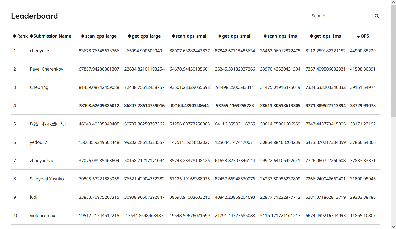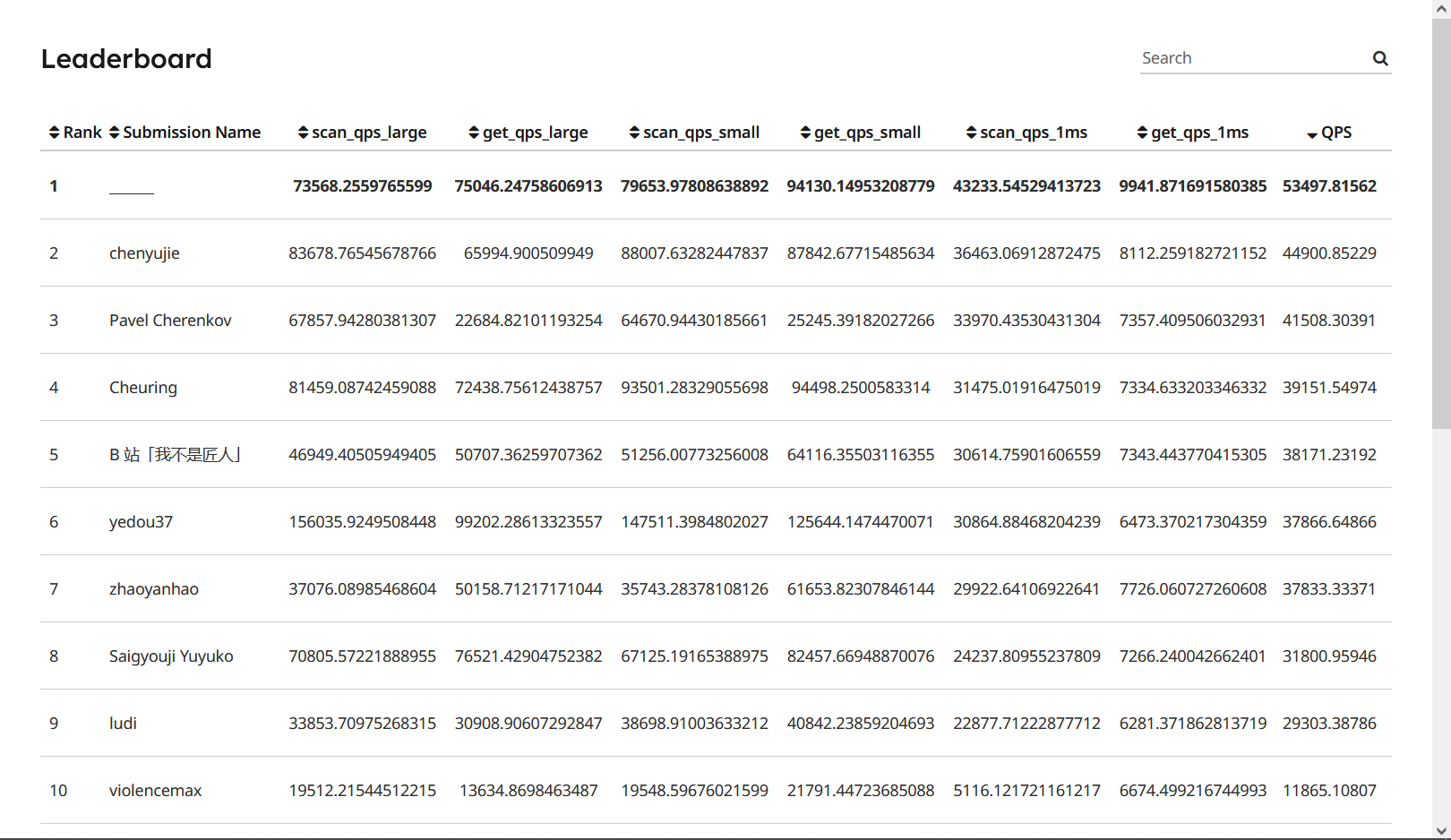 在上一节的提交中,我的 (scan|get)_qps_(large|small) 数值很高,但是 (scan|get)_qps_1ms 以及总 QPS 非常低,而且 leadboard 上排行前几(默认排序)的数据中有好几个和我情况是一样的。