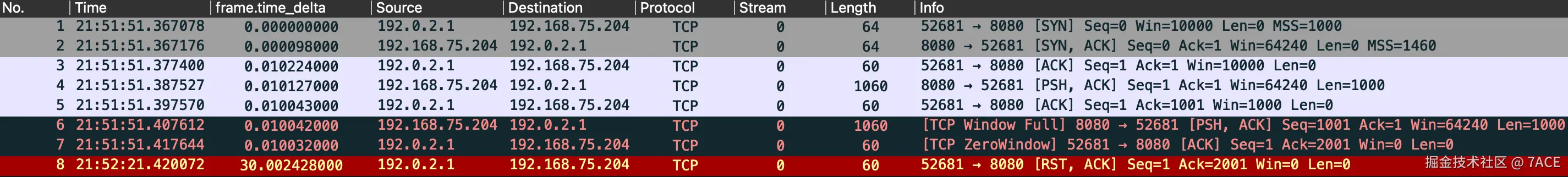 问题是 No.8 和 No.7 的间隔时间,也就是 2 秒+,是如何得来的,也就是什么时候会发送 TCP ZeroWindowProbe 数据包。