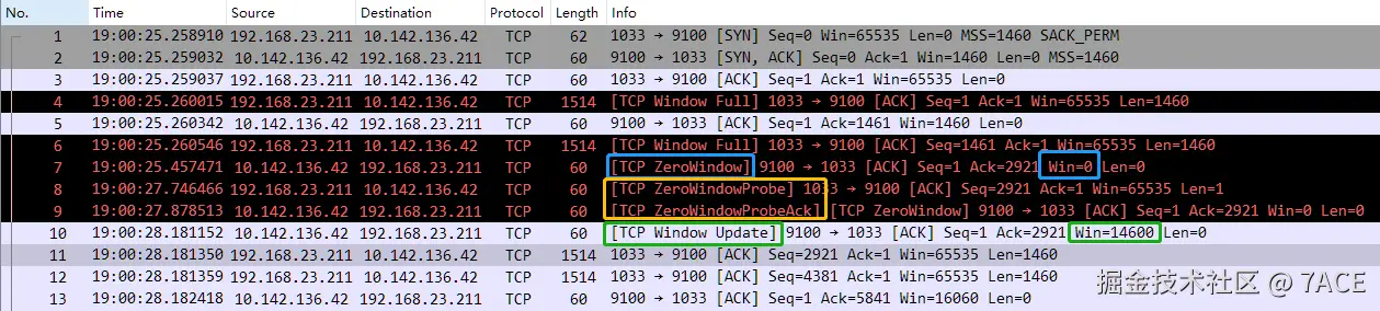 其中一个案例如下:首先客户端发送数据,发现服务器接收窗口满了,则在 No.4 和 No.6 上标识 [TCP Window Full] ,此时服务器端 No.7 因为 Win 为 0 且未设置 SYN、FIN、RST 的情况下,标识为 [TCP ZeroWindow],之后陷入等待,大概 2 秒+后,客户端发送了 No.8 [TCP ZeroWindowProbe] 用于确认服务器端接收窗口是否恢复,服务器紧接着回复确认 No.9,表示仍处于零窗口未恢复,标识为 [TCP ZeroWindowProbeAck] + [TCP ZeroWindow] ,又再过了 300ms 后,服务器端发送 No.10 Win 此时更新为 14600,表示接收窗口已恢复,标识成 [TCP Window Update] ,至此完成一次完整的零窗口出现、探测及恢复过程。