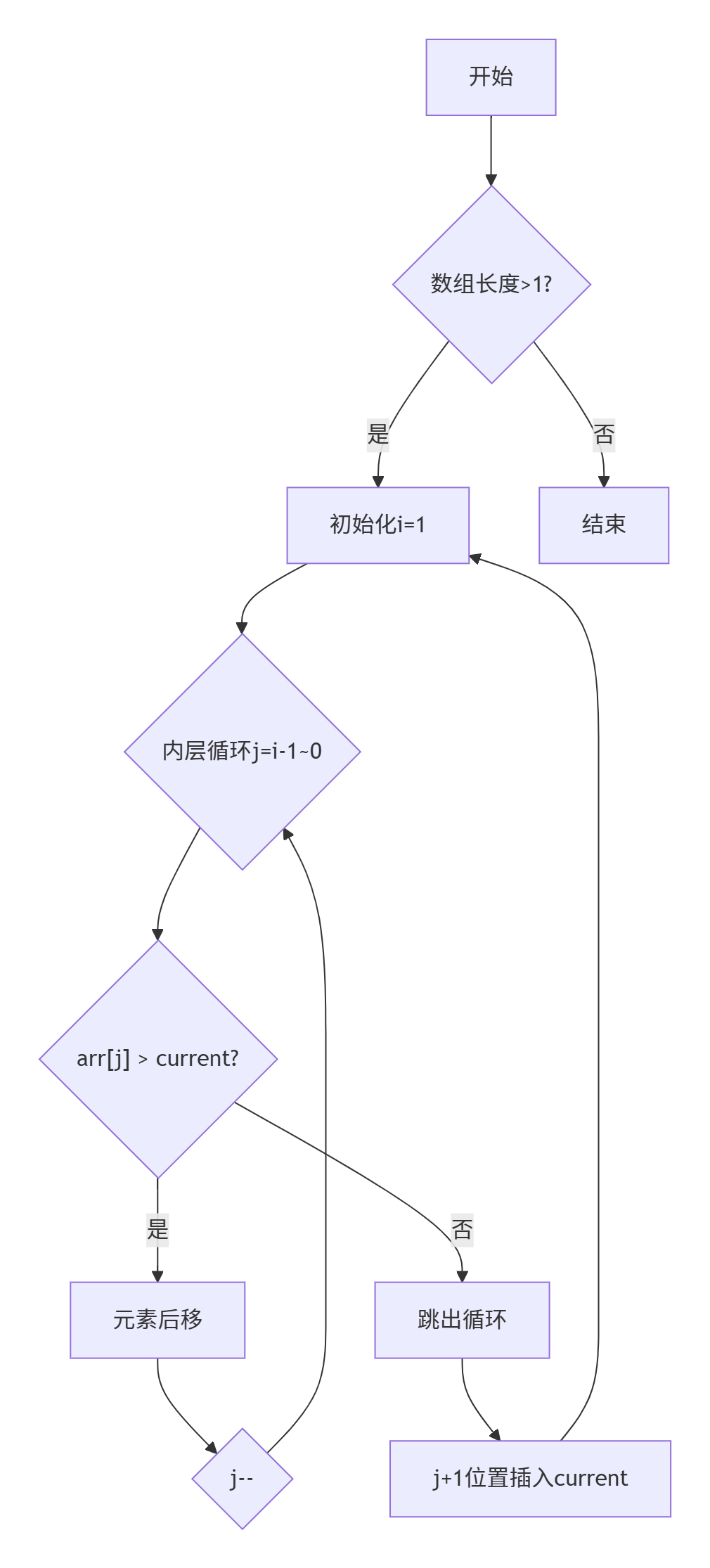 - 元素移动:将大于待插入元素的元素依次后移,腾出插入位置