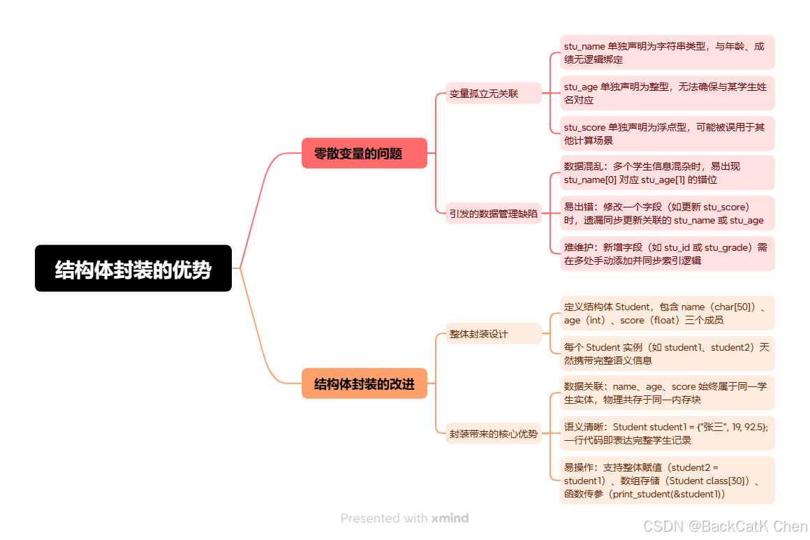 - 简单变量:只能存储单一类型数据,若用多个独立变量表示一个对象(如stu_name、stu_age、stu_score),数据之间失去关联性,代码可读性差、维护成本高;
