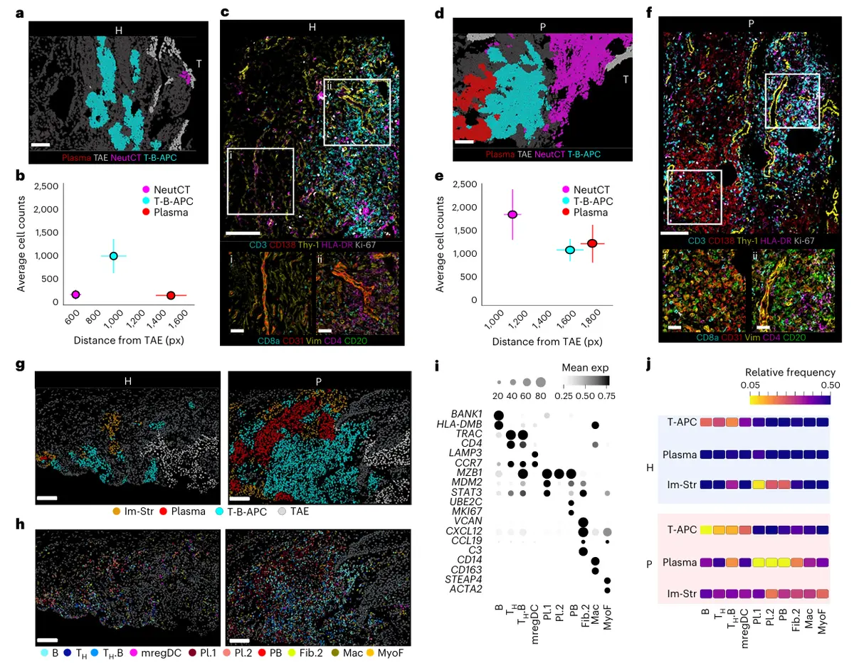 免疫细胞在TAE外侧呈现 "中性粒细胞区 → T-B-APC区 → 浆细胞区" 的同心圆式分层布局,且该基本框架在健康与疾病中保持稳定。