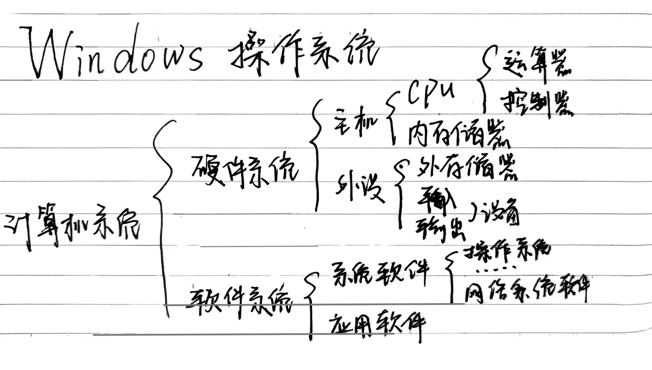 - 硬件系统:主机(CPU、内存、主板) + 外设(输入设备:键盘 / 鼠标;输出设备:显示器 / 打印机;存储设备:硬盘 / U 盘)