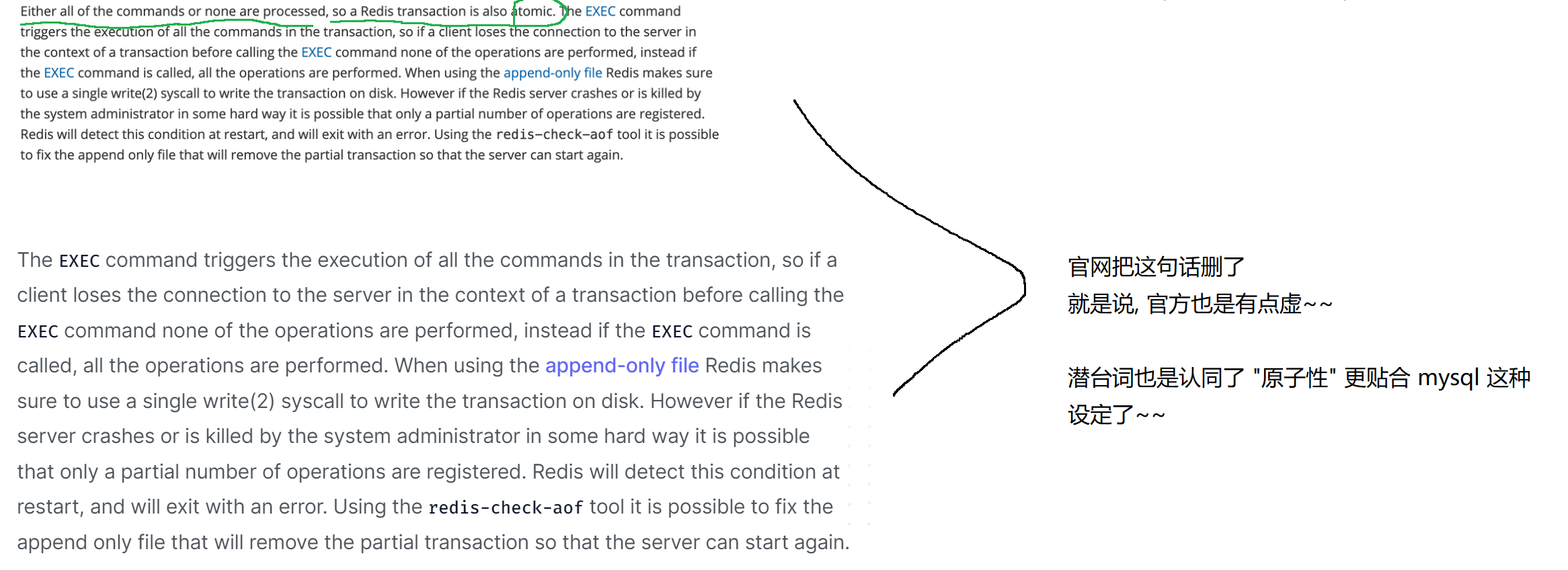 旧版本Redis官网上关于 事务介绍的一个截图