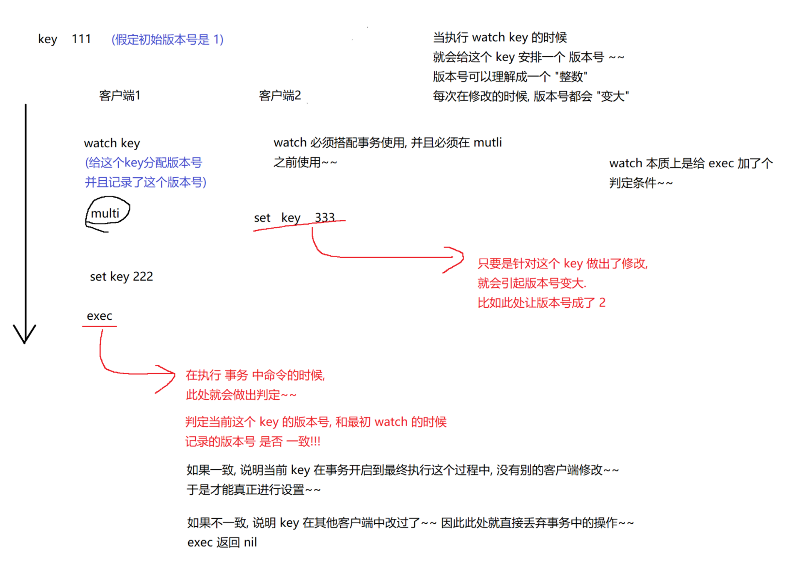 WATCH会记录当前版本号快照 -