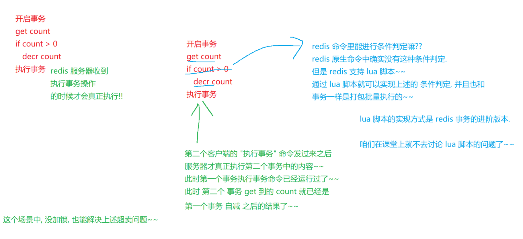 复杂逻辑 优先 Lua,事务更多用于简单并发控制。