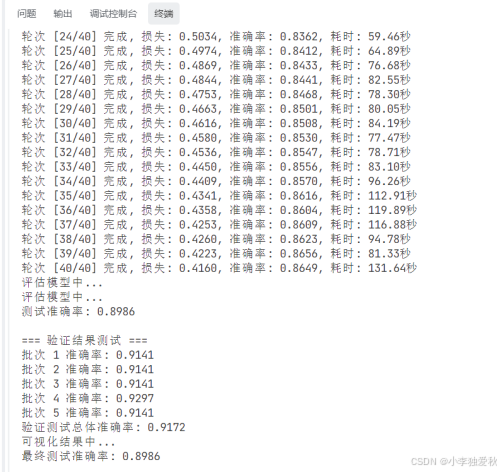 图1详细记录了40轮训练过程中模型性能的演变轨迹。从第24轮到第40轮,损失值从0.5034稳步下降至0.4160,准确率从83.62%提升至86.49%,呈现出良好的收敛趋势。训练耗时在59.46至131.64秒之间波动,可能与计算资源调度和批次处理复杂度有关。特别值得注意的是,在训练后期损失下降速度减缓而准确率仍持续提升,表明模型正在学习更精细的特征表示。测试阶段达到89.86%的准确率,显著高于训练准确率,验证了模型具有良好的泛化能力。验证测试中五个批次的准确率稳定在91.41%至92.97%之间,总体准确率达91.72%,进一步证实了模型预测的稳定性。