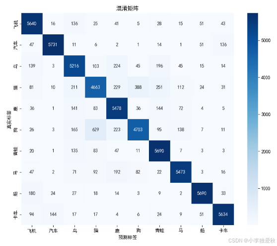 图3的混淆矩阵揭示了模型在10个类别上的详细分类表现。对角线元素代表正确分类的样本数,其中汽车(5731)和飞机(5640)识别率最高,反映出这些类别具有较明显的视觉特征。非对角线元素显示了类别间的混淆情况,特别是猫(139)和狗(26)等动物类别的误判较多,这与实际中这些类别形态相似性较高相符。矩阵整体呈现明显的对角线优势,但部分非对角线元素值偏高,指示了模型在细粒度分类上的挑战。颜色渐变直观反映了分类质量,深蓝色区域集中在对角线,浅蓝色分散在非对角线,符合优质分类器的典型特征。
