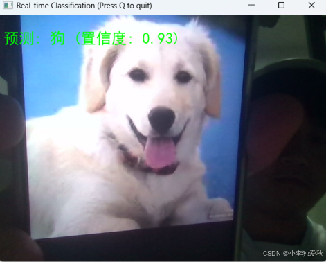 图4反映的白色狗的实时分类结果(置信度0.93)进一步验证了模型的鲁棒性。尽管图像包含复杂背景和动态表情,模型仍能准确识别并给出高置信度评分。狗的蓬松毛发和独特形态为分类提供了充分特征,而高置信度表明模型对该类别的特征学习较为充分。界面中的人物身影暗示了实际应用场景的复杂性,模型在此环境下仍保持稳定性能,展现了良好的环境适应性。