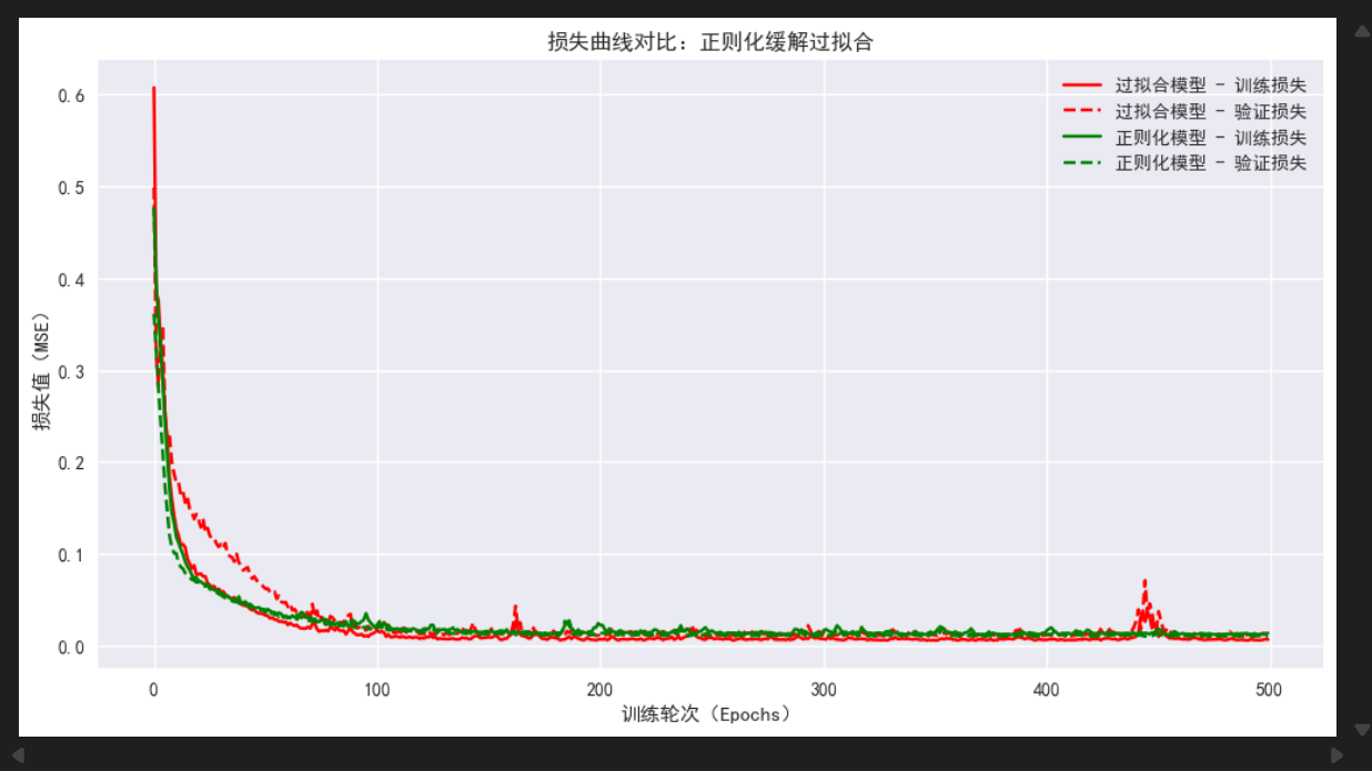 训练损失略有上升,但验证损失大幅下降:过拟合模型的训练损失极低(≈0.006),但验证损失很高(≈0.013);正则化模型的训练损失有上升(≈0.013),但验证损失却下降了(≈0.011)------这说明模型在训练集和验证集上的表现差不多,放弃了"完美拟合噪声",转而学习核心规律,泛化能力显著提升;