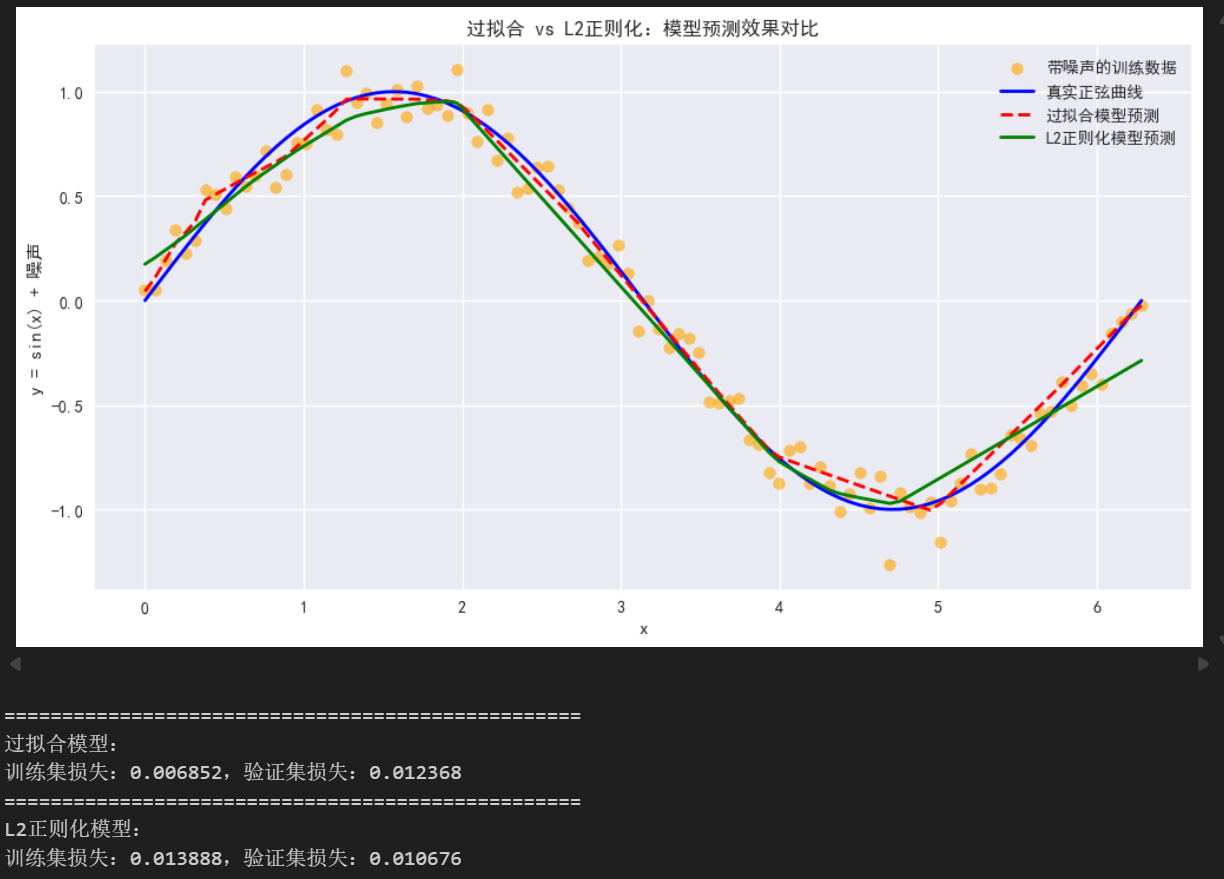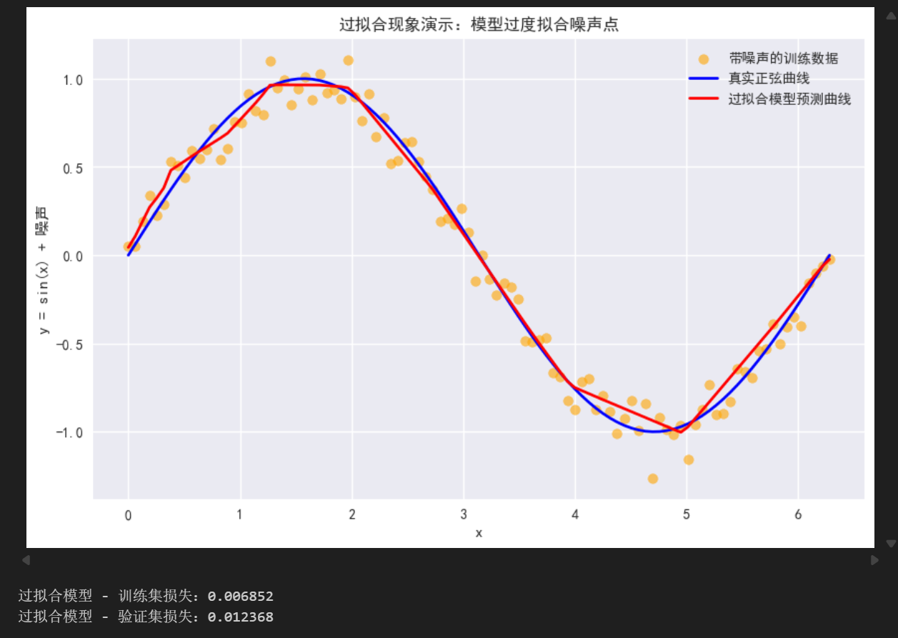 我们的任务是:拟合一组带有噪声的正弦曲线数据。理想情况下,模型应该学习到正弦曲线的整体趋势;但如果模型"过度努力",就会去拟合每一个噪声点,最终失去泛化能力------这就是过拟合。
