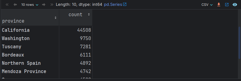 # 1. 计算 葡萄酒最多的10个产地.