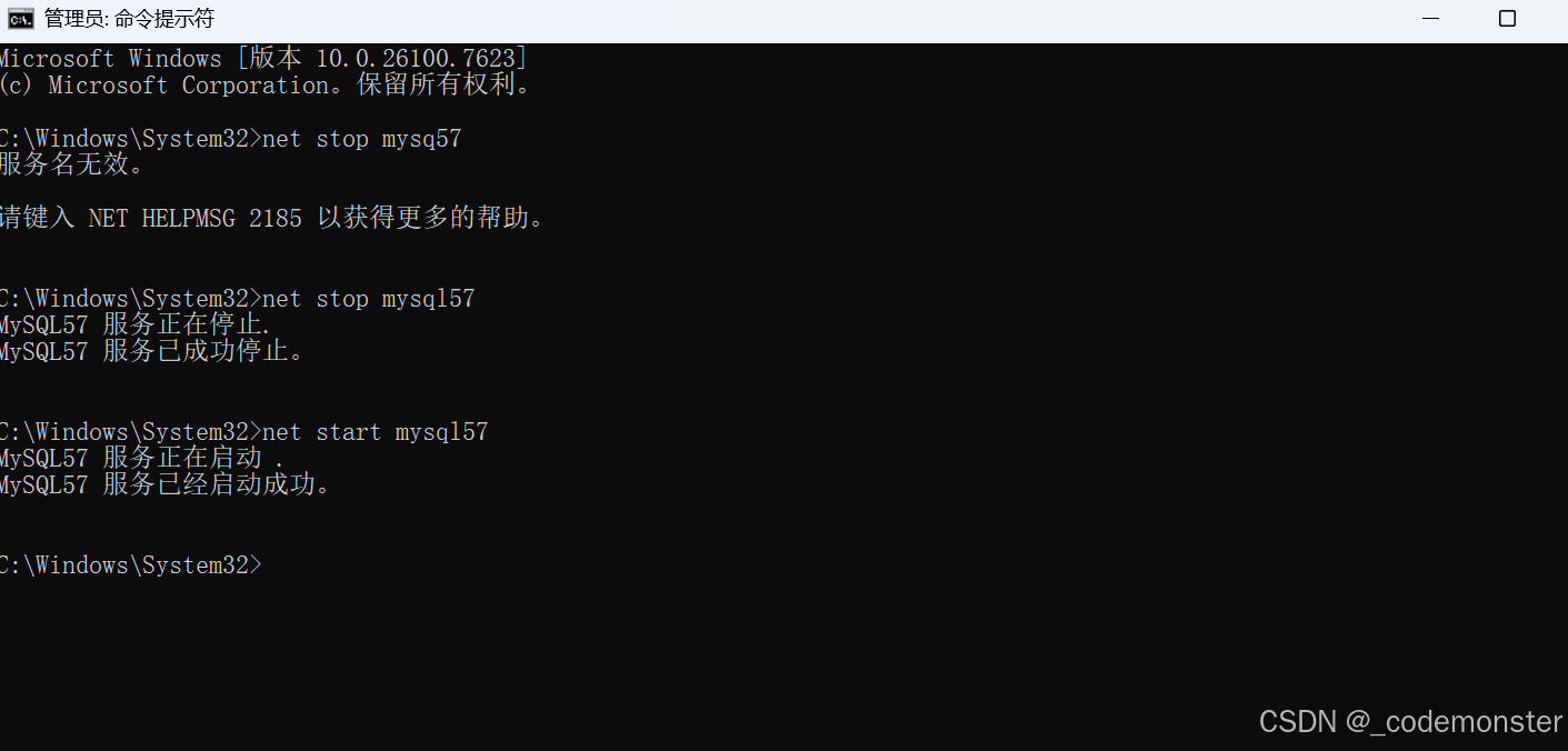 我们可以看到服务名是mysql57这里服务不区分大小写。所以可以直接在cmd中启停该服务,以管理员身份运行cmd。
