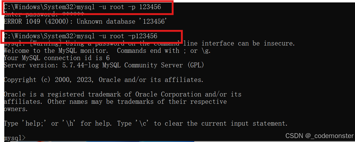 说明:-p和密码之间不能有空格,必须直接相连,不然会和下面一样报错。Unknown database '123456'