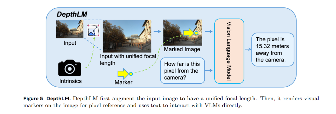 视觉提示替代文本坐标,精准定位像素:摒弃以往用文字标注像素坐标的方式,直接在图像上为查询像素渲染箭头、十字等视觉标记,搭配简单文本提问"该点离相机多少米",让VLM精准识别目标像素,解决像素参考偏差问题;