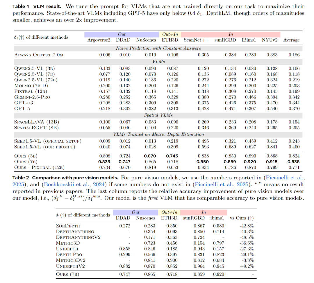 媲美顶尖纯视觉模型,首次实现VLM的专业级精度:DepthLM的70亿参数模型,δ₁指标达到0.838,可与DepthPro、Metric3Dv2等顶尖纯视觉深度模型比肩,成为首个在度量深度估计上达到专业纯视觉模型精度的VLM;