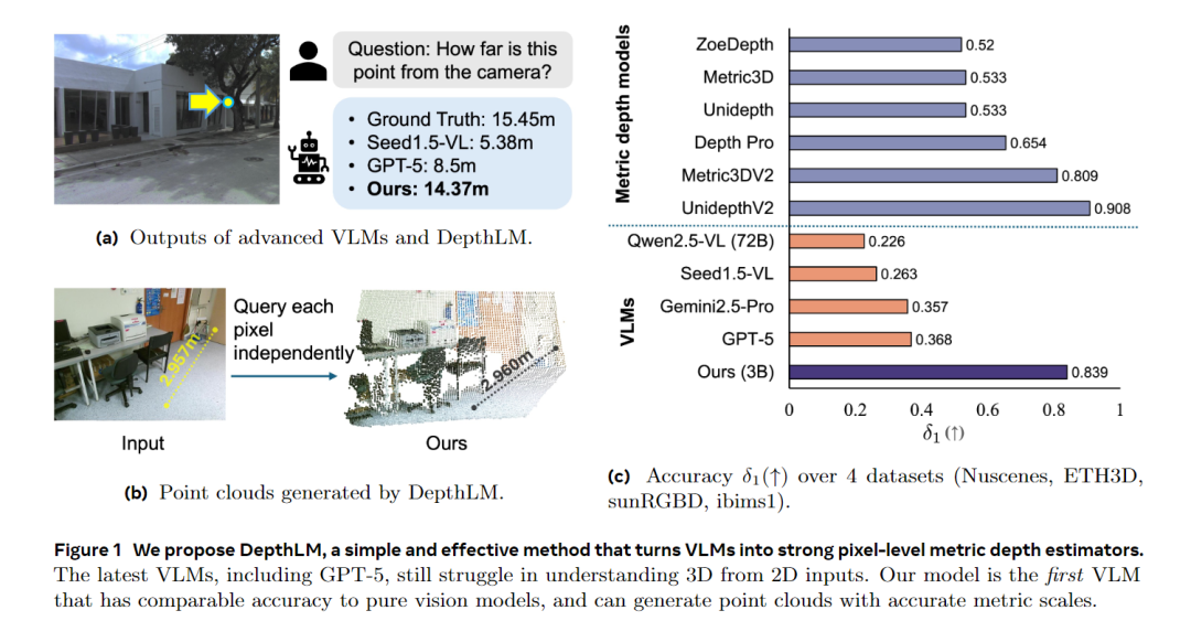 碾压主流VLM,精度提升超2倍:30亿参数的DepthLM模型,在4个室内外数据集上的δ₁指标,远超GPT-5、Gemini-2.5-Pro、Qwen2.5-VL等先进VLM,精度提升超2倍,对比同量级VLM甚至有8倍提升;