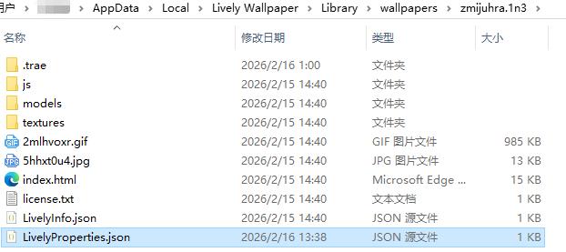 %USERPROFILE%\AppData\Local\Lively Wallpaper\Library\wallpapers\0wj1biqk.f41,该路径是当前加载插件(文件夹0wj1biqk.f41即为单个插件的存储目录)的根目录,LivelyProperties.json直接保存在此文件夹内,插件的所有持久化配置(如你在配置面板修改的参数)均会写入此文件,关闭 Lively 后不会丢失,也是插件加载时优先读取配置的路径。 -