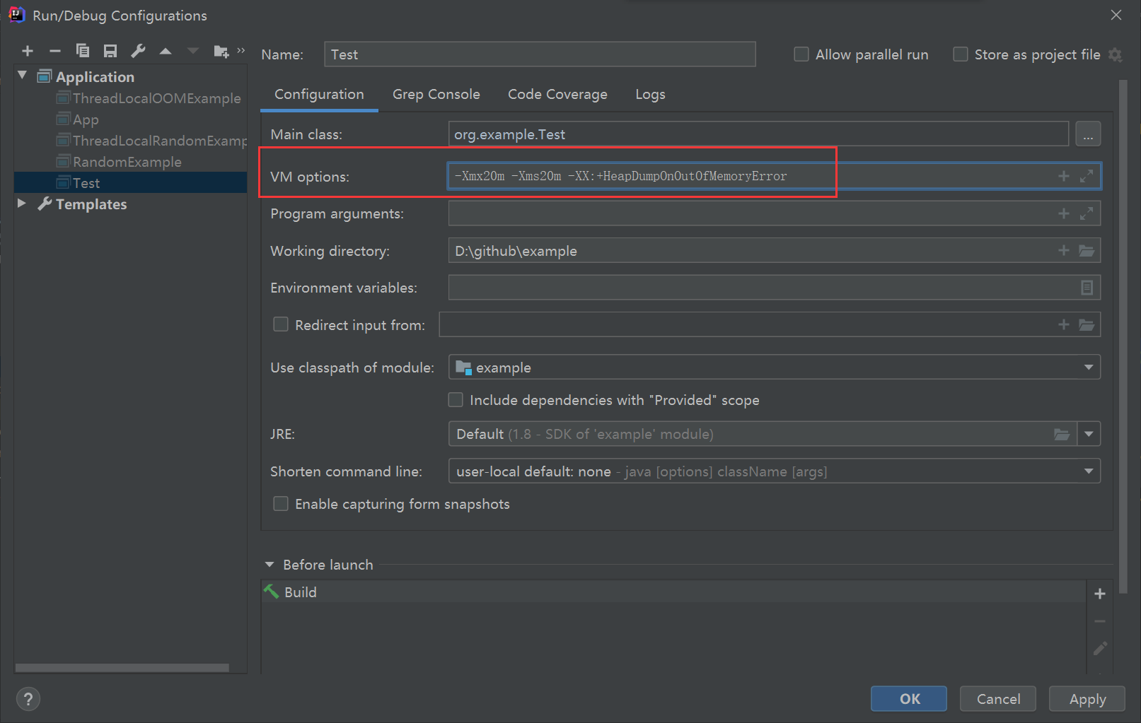 上节中已经讲到了,可以设置JVM参数-Xms:设置堆的最⼩值、-Xmx:设置堆最⼤值。下⾯我们来看⼀ 个Java堆OOM的测试,测试以下代码之前先设置Idea的启动参数,如