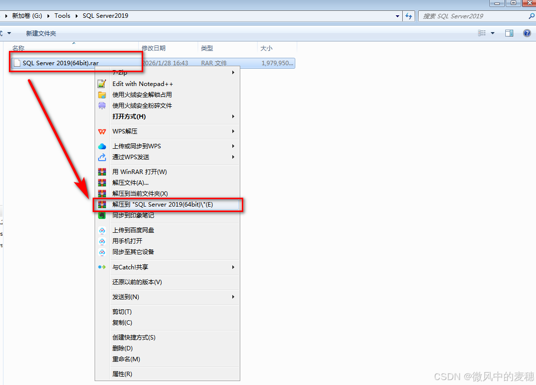 下载完成后,右键点击压缩包,选择"解压到当前文件夹"或指定解压至"SQL Server 2019"目录