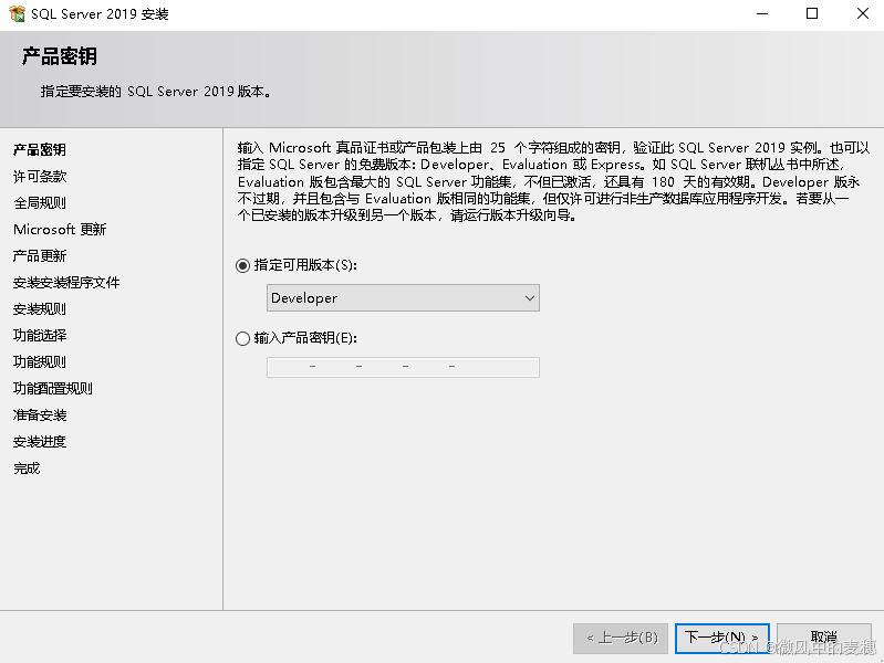 在产品密钥页面选择"Developer"版本(适用于开发测试),接受许可条款后继续
