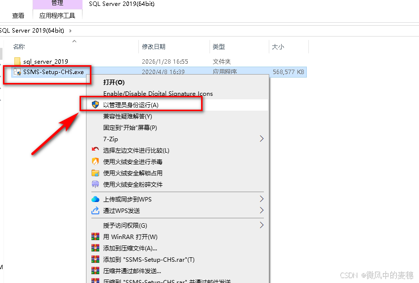 返回解压目录,找到SSMS-Setup-CHS.exe文件,右键以管理员身份运行