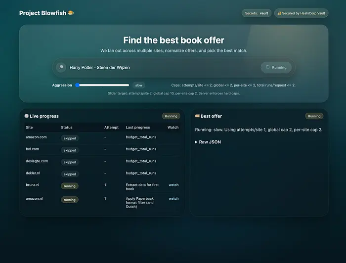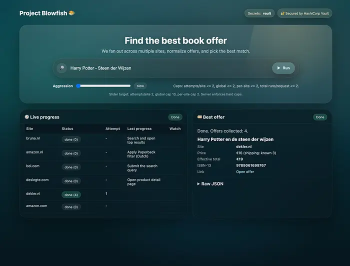 TinyFish (通过 Mino)使其成为可能。他们的 API 很简单:你提供 URL 和目标,然后获得结构化输出。这种简单性使得将 Blowfish 构建为一个有趣的副项目变得可行,而不是意外发明一个新的爬虫平台。