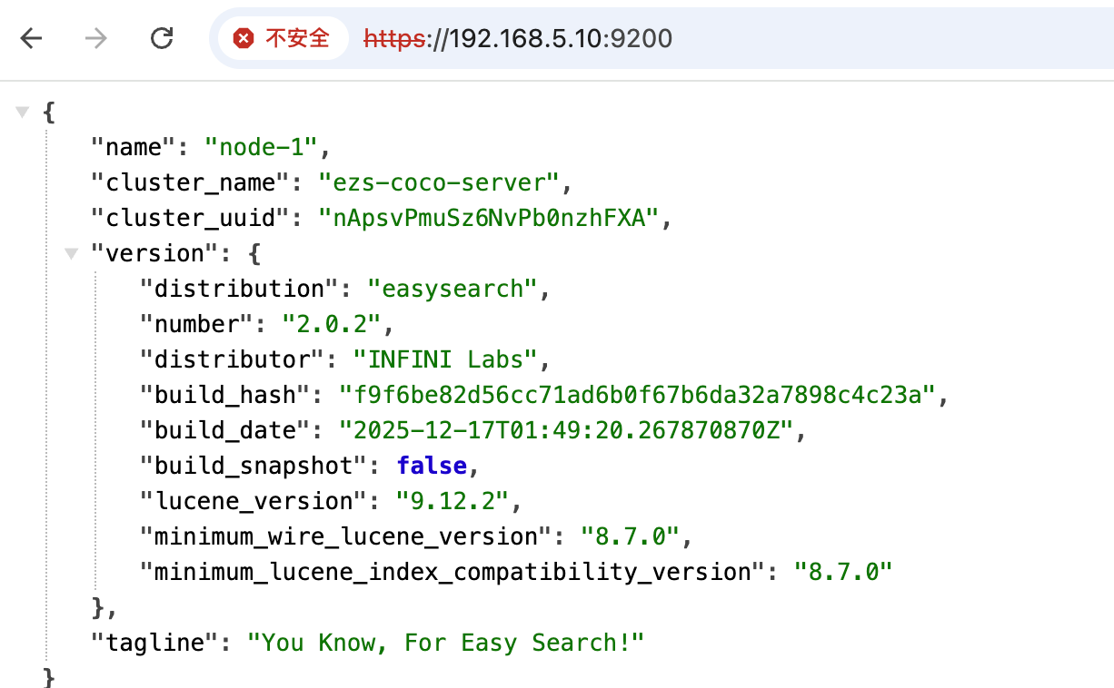 然后重启服务,就能通过 https://IP:9200 的方式访问 cocoserver 自带的 Easysearch 了。
