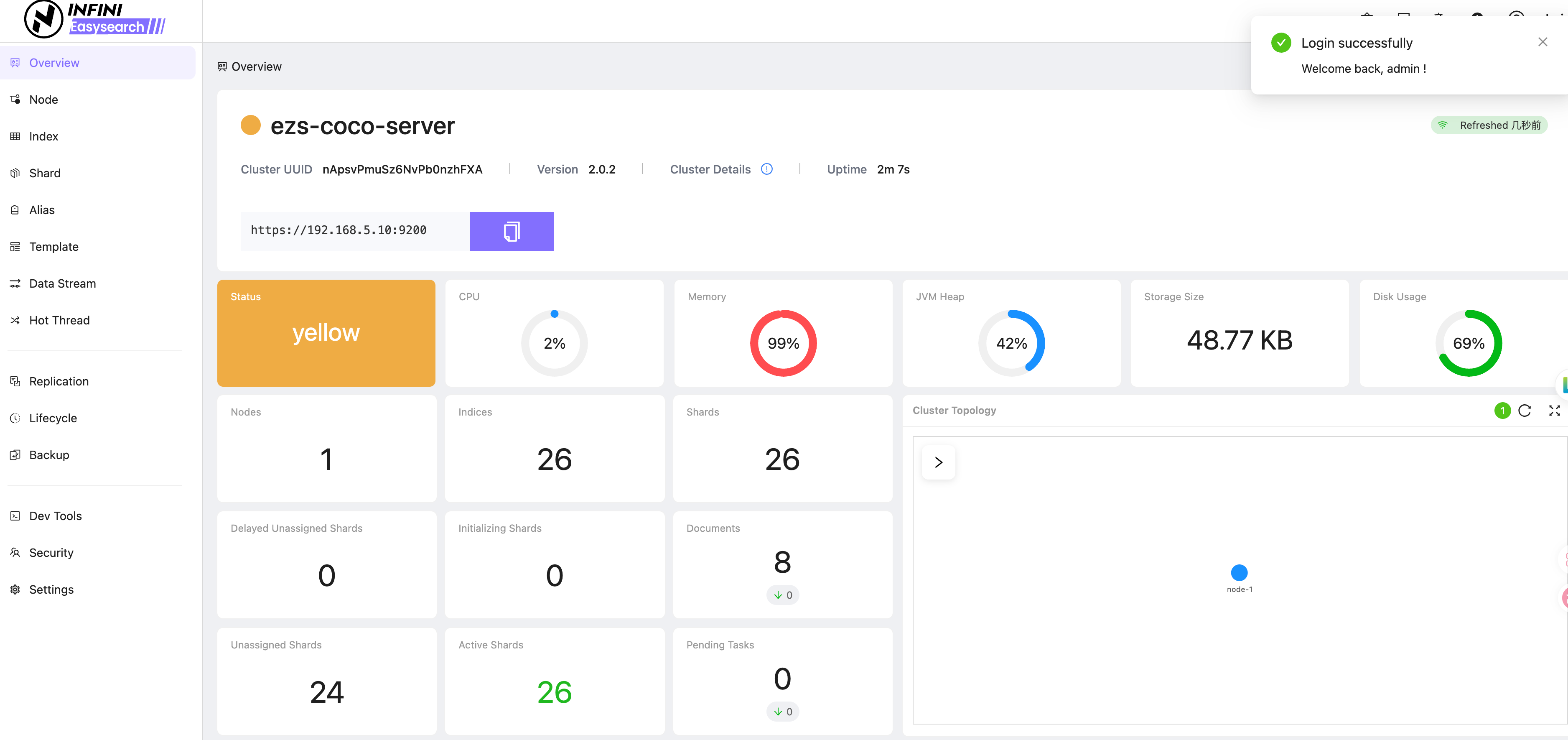 然后我们就收获了一台可以在 Coco server 里使用的 Easysearch,可以实时查看数据。