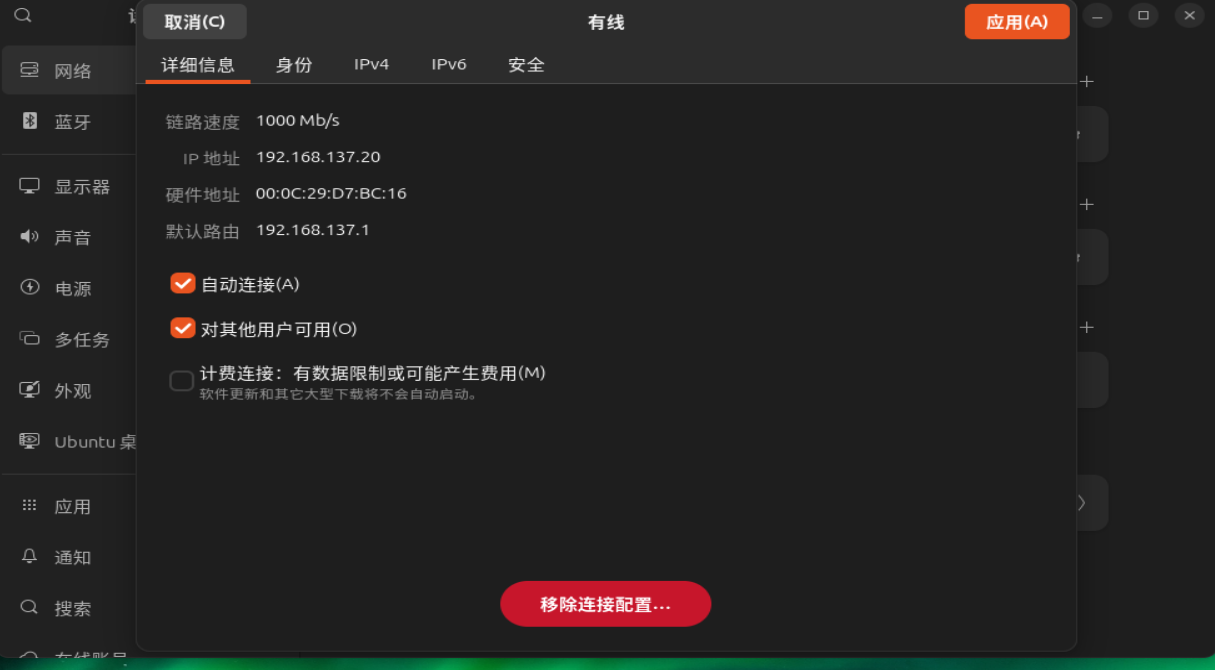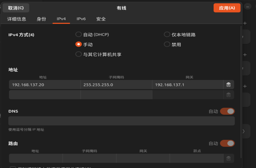 勾选手动,然后配置 ip 地址,子网掩码和网关。完成后点击应用,退出。