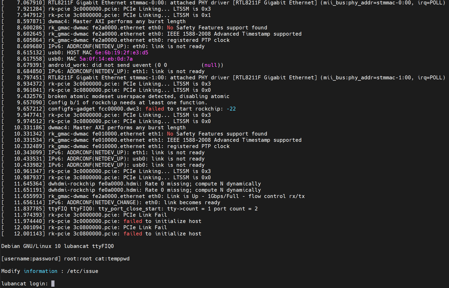 如果用的是别的板子,通常可以在提示信息中看到密码,如上图中的倒数第三行信息,可以看到普通和root用户的账户名和密码。