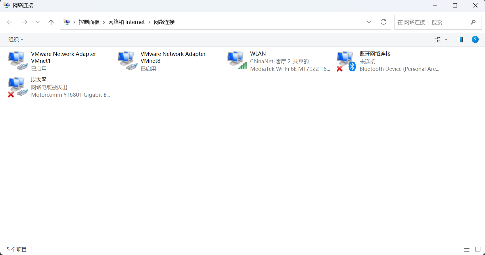 我的电脑连的是 WIFI ,我们按下 Win + R,输入 cmd 然后回车打开终端,在终端输入ncpa.cpl然后按下回车,会弹出下面这个界面: