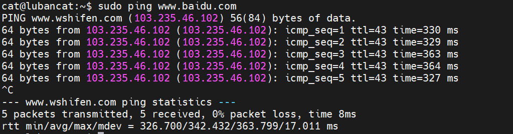 下面我们再ping一下百度,看看能不能通: