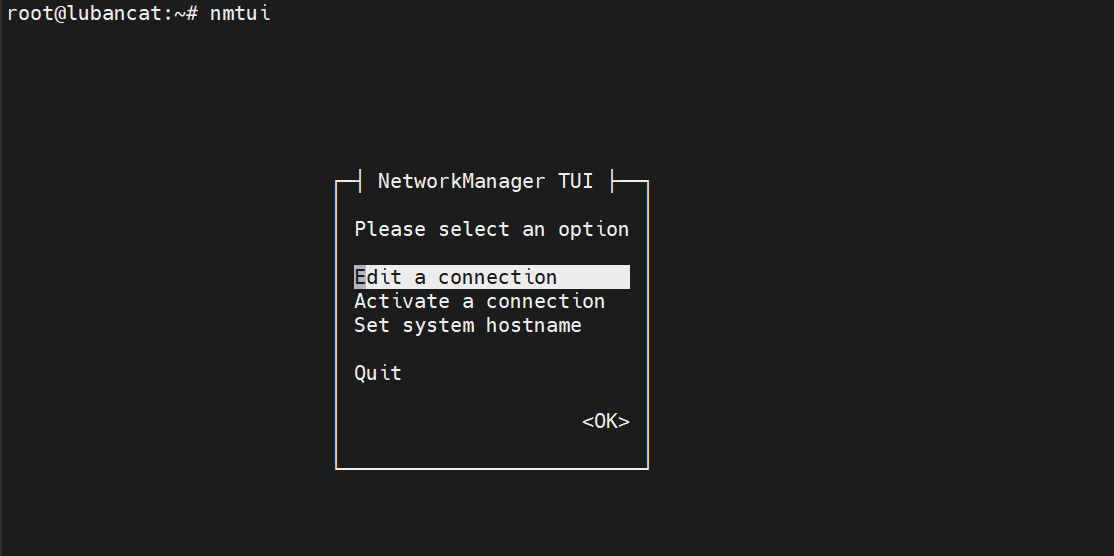 我们这里要配置的是eth0。我们使用 nmtui 图形化界面配置静态 IP ,终端执行nmtui命令,会弹出以下界面: