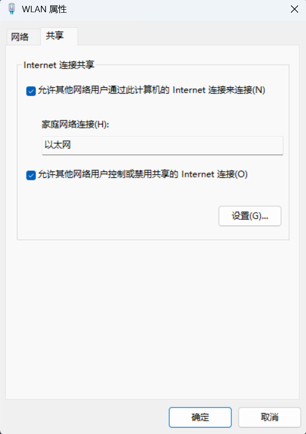 找到 WLAN (WiFi) 适配器,然后右键点击,选择属性 选项,然后再点击共享 ,勾选 允许其他网络用户通过此计算机的 Internet 连接来连接 ,在家庭网络连接 下拉框里,选择你插着板子的那个以太网口。如下图,完成后点击确定即可。