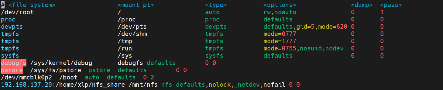 192.168.137.20:/home/xlp/nfs_share /mnt/nfs nfs defaults,nolock,_netdev,nofail 0 0