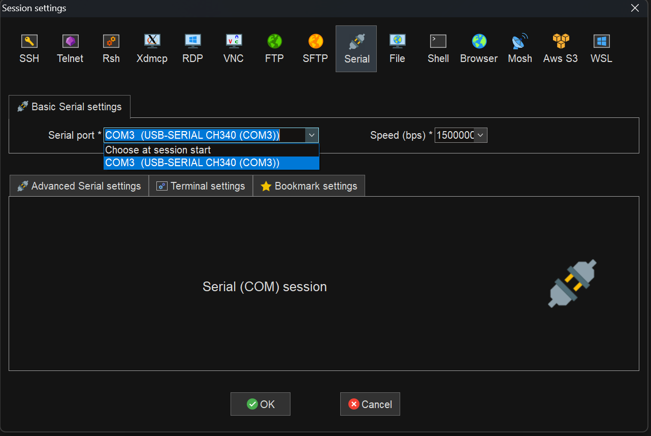 我们选择好串口对应的端口,并设置波特率为1500000,一百五十万。